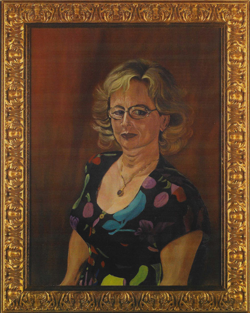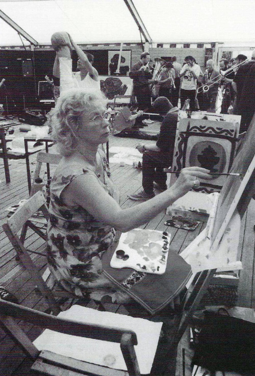 Karin Mustereit Karin Mustereit inmitten einer Musikergruppe vom Jazz-Festival Moers, 2000 Karin Mustereit, `Ich die Karin´, Öl auf Leinwand in Blattgold Rahmen, 90 x 120 x 5 cm, 2001