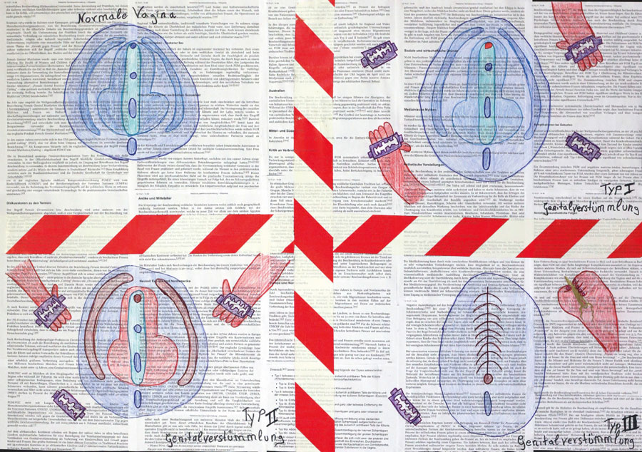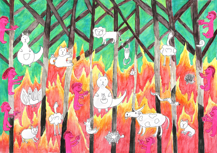 Melanie Jacobi, Meerbusch, 2018Melanie Jacobi, `Feuer im Urwald´, Stift und Tinte auf Papier, 50 x 40 cm, 2021Melanie Jacobi, `Angelhakenquäler´, Stift und Tinte auf Papier, 30 x 20 cm, 2021Melanie Jacobi, `Sehnsucht I´, Stempeltinte, Filzstift und Tinte auf Papier, 30 x 20 cm, 2023Melanie Jacobi, `Sehnsucht II´, Stempeltinte, Filzstift und Tinte auf Papier, 30 x 20 cm, 2023Melanie Jacobi, `Sehnsucht III´, Stempeltinte, Filzstift und Tinte auf Papier, 30 x 20 cm, 2023Melanie Jacobi, `Sehnsucht IV´, Stempeltinte, Filzstift und Tinte auf Papier, 30 x 20 cm, 2023Melanie Jacobi, `Corona´, Gipsfigur mit Licht und Zahnprothese, 65 x 55 x 35 cm, 2022Melanie Jacobi, `Verstümmelung´, Informationsblätter, Absperrband und Buntstift auf Papier, 100 x 70 cm, 2022Melanie Jacobi, Performance in Berlin, 2022Melanie Jacobi, Performance in Berlin, 2022