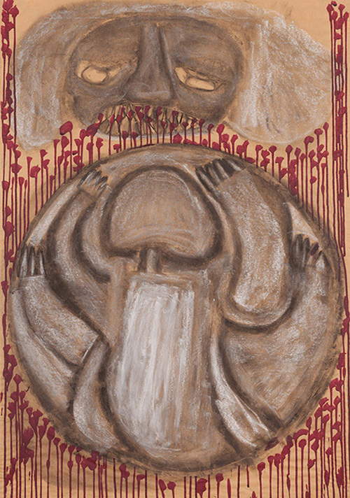 Christel Bischoff, `Vergewaltigung´, Pastellkreide und Kupferemulsion auf Karton, 100cm x 70cm, 2001